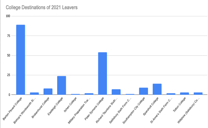 Most of out pupils go on to college and we are lucky to have about 15 institutions that pupils can choose from depending on where they live, the next level of course that is going to be suitable for them or in some cases the only place that offers a very specific course. Attendance at different colleges varies from year to year, sometimes dependent on the number of pupils who are based in Romsey or Southampton and therefore often choose to stay nearer to home for choice of college. The two colleges that attract the largest numbers of our pupils are Barton Peveril and Peter Symonds Colleges and this has been the case for the last 23 years - which is the number of years I have been recording this data.